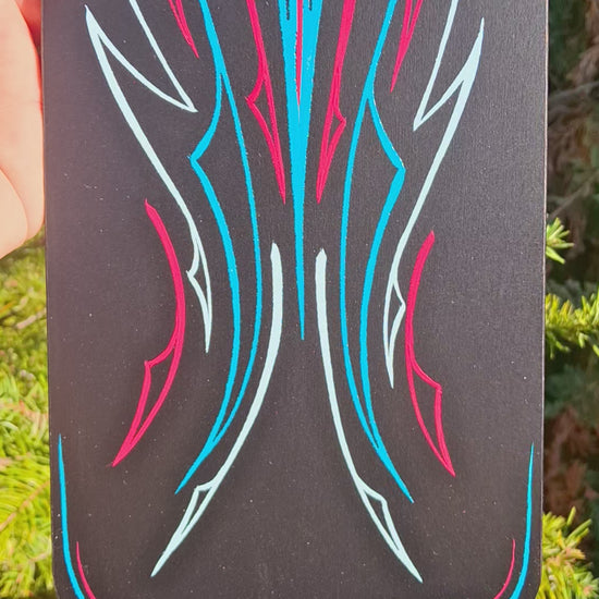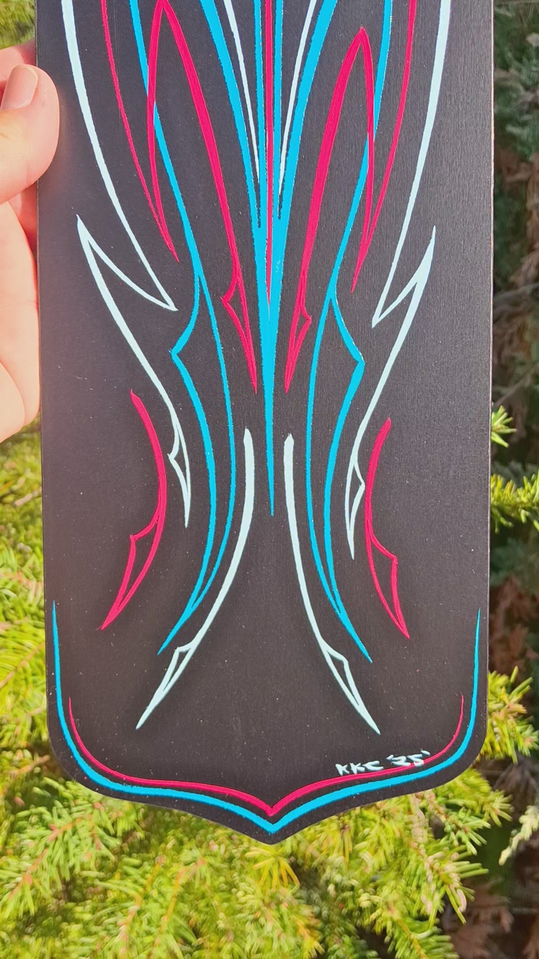 A black fan blade, pinstriped with magenta, teal & light blue! Great wall hanger or order a set to deck out your fan!